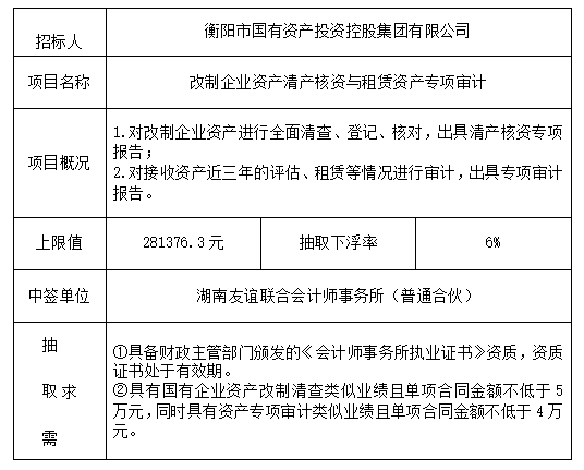改制企業資產清產核資與租賃資產專項審計于2025年10月17日在衡陽國投4棟3樓評標室進行了隨機抽取,現將相關信息予以公示。