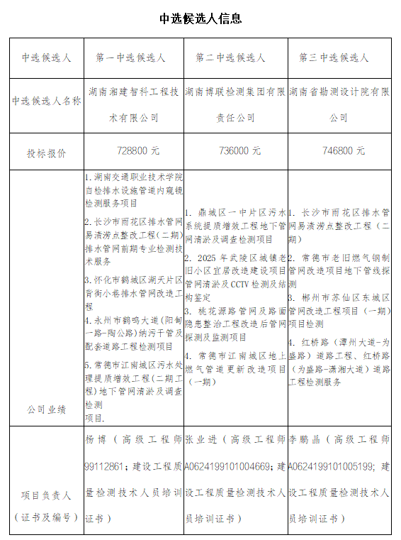 衡陽紡織機械廠地塊地下管網盲探及檢測工程于2025年11月17日在衡陽國投4棟3樓評標室進行了比選開標、評標活動,評標委員會按照比選文件及相關法律法規規定進行評審,推薦以下三名中選候選人(排序),現將相關信息予以公示。